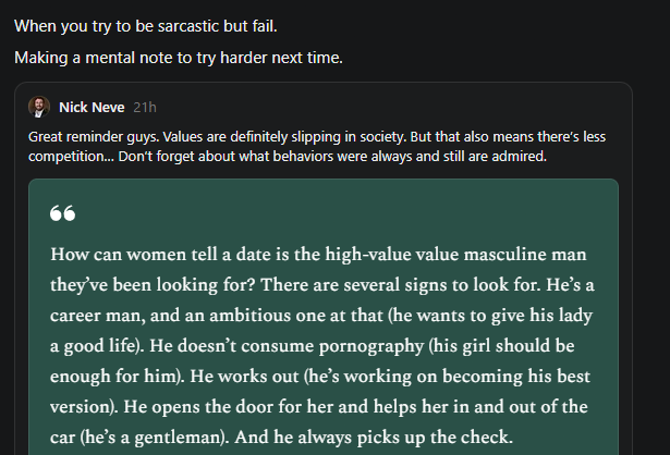 After reposting this excerpt from an article I had read, I was surprisingly met by the author saying that she was being sarcastic.